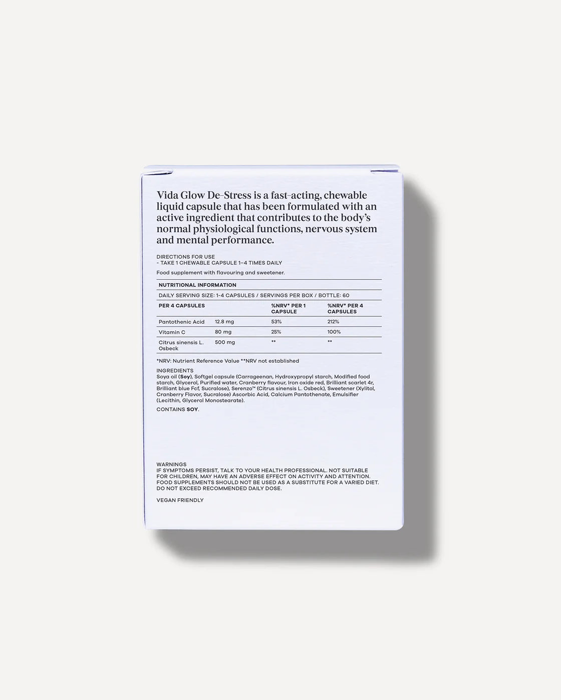 De-Stress is a cranberry-flavoured chewable liquid burstlet delivering calm when you need it most. Scientifically formulated with a clinically studied botanical extract and key mood stabilising active ingredients – including vitamin C and vitamin B5 – De-Stress targets immediate feelings of stress while working to promote healthy emotional balance and improve general health.